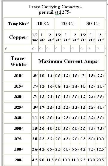 举例说,线宽0.025 英寸,采用2 oz.盎斯的铜,而允许温升30 度,