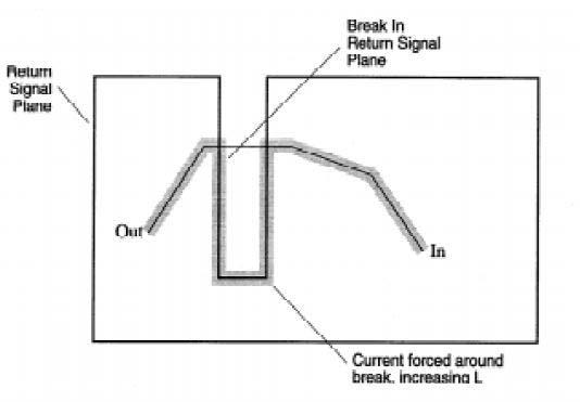 任何一根信号线中的电流都要通过和它临近的地平面来回到它的驱动端,所以我们进行地的分割的时候要避免避免割断高速信号的回留路径,如下图所示: