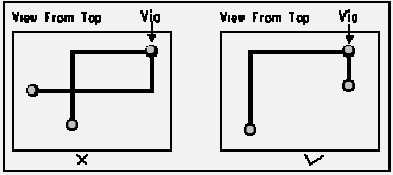 与过孔相似,直角的路径转动应该被避免,因为它在内部的边缘能产生集中的电场。该场能产生耦合到相邻路径的躁声,因此,当转动路径时全部的直角路径应该采用45度的。 图5是45度路径的一般规则。