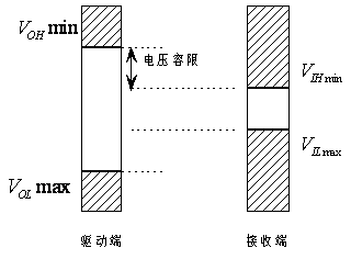 电压容限是指驱动器的输出与接收端输入在最坏情况下的灵敏度之间的差值。很多器件都是输入电压敏感的。图中显示了驱动器输出与接受器输入电压之间的逻辑关系。