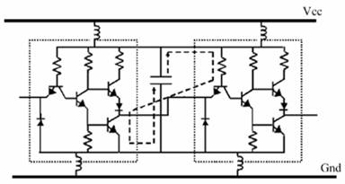 我们从一个典型逻辑电路入手,讨论局部退耦设计方法。图7是典型的非门(NOT GATE)电路。当输入(Input)低电平时,Q1打开,拉低Q2的基极,因此Q4的基极被拉低,Q3打开,输出(Output)高电平。
